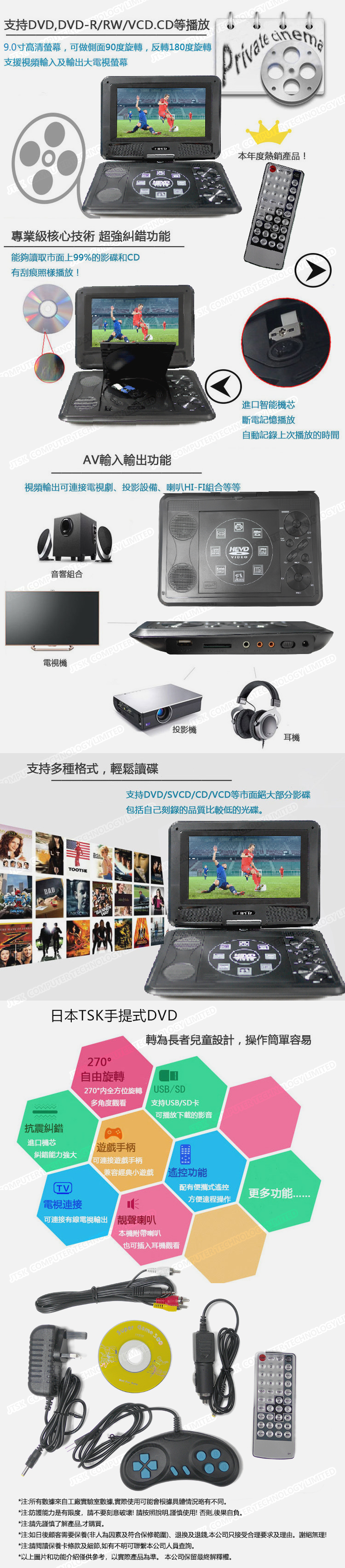 9寸高清多功能手提DVD/270度旋轉屏幕/附送遊戲手掣/行貨一年保養