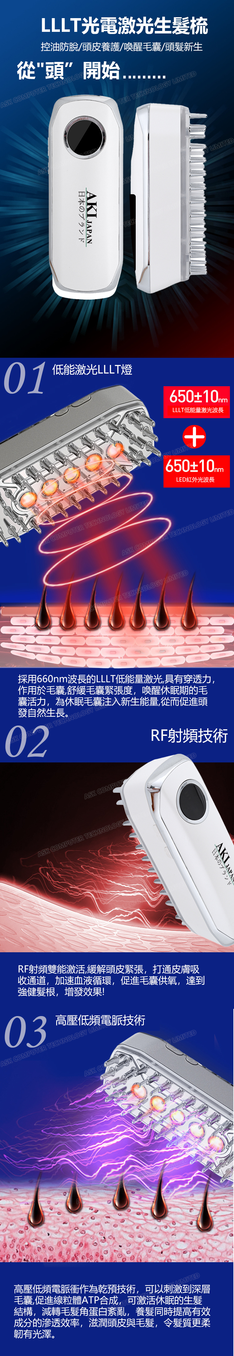 日本AKI 便攜式激光紅外線EMS頭皮護理生髮梳 震動按摩生髮儀