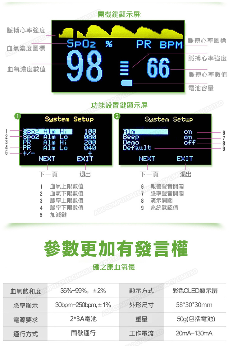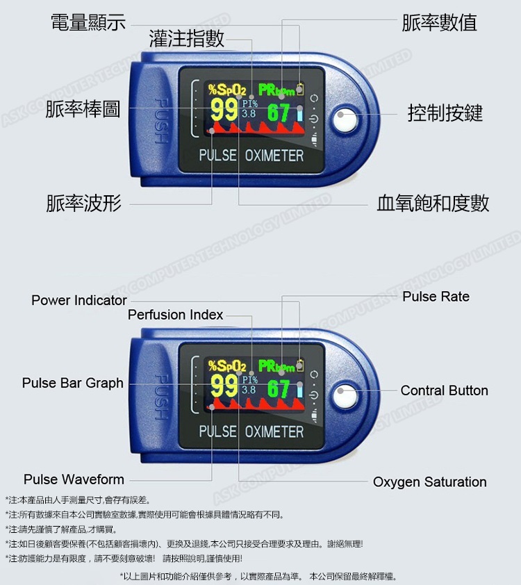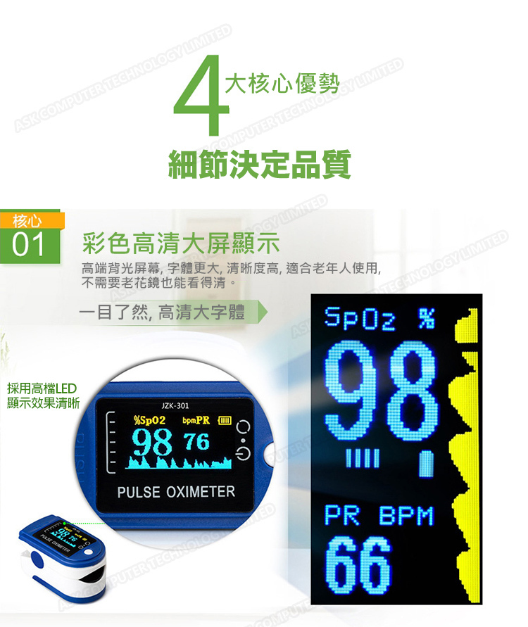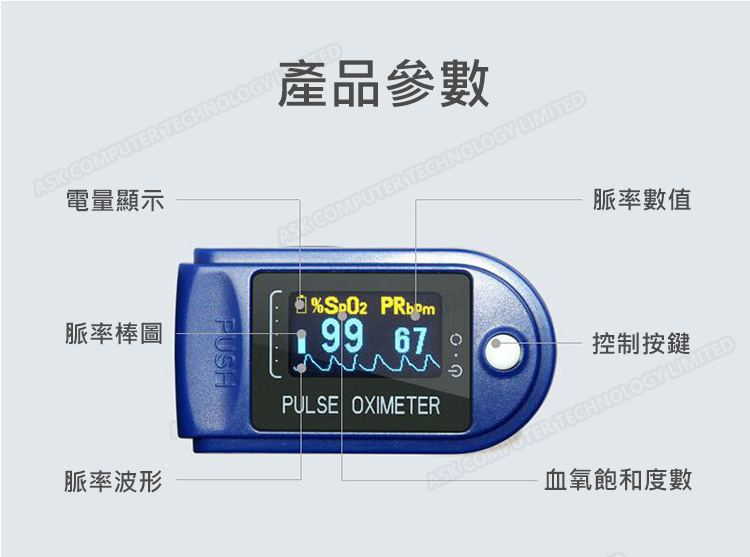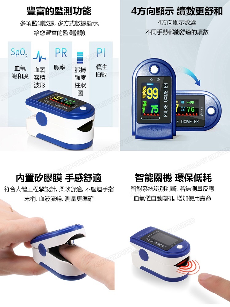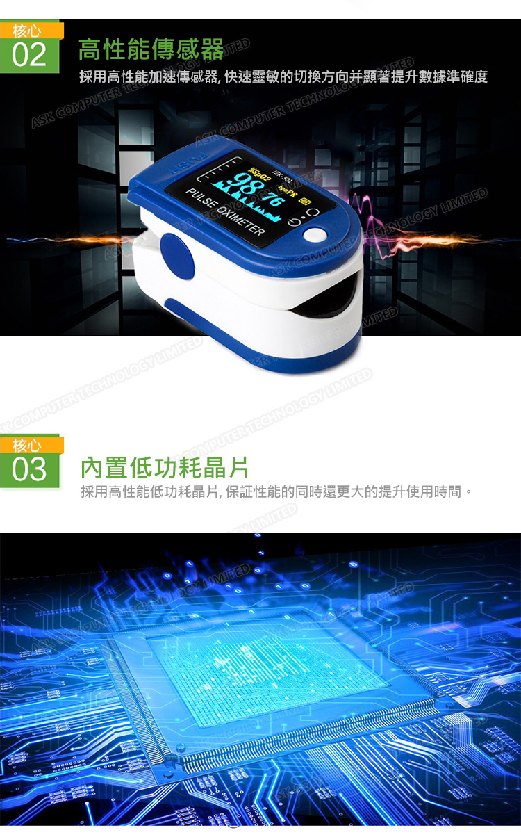 ■測量精度:血氧飽和度在70%-99段為±2%,小於70%無定義,脈率為±2 BPM。