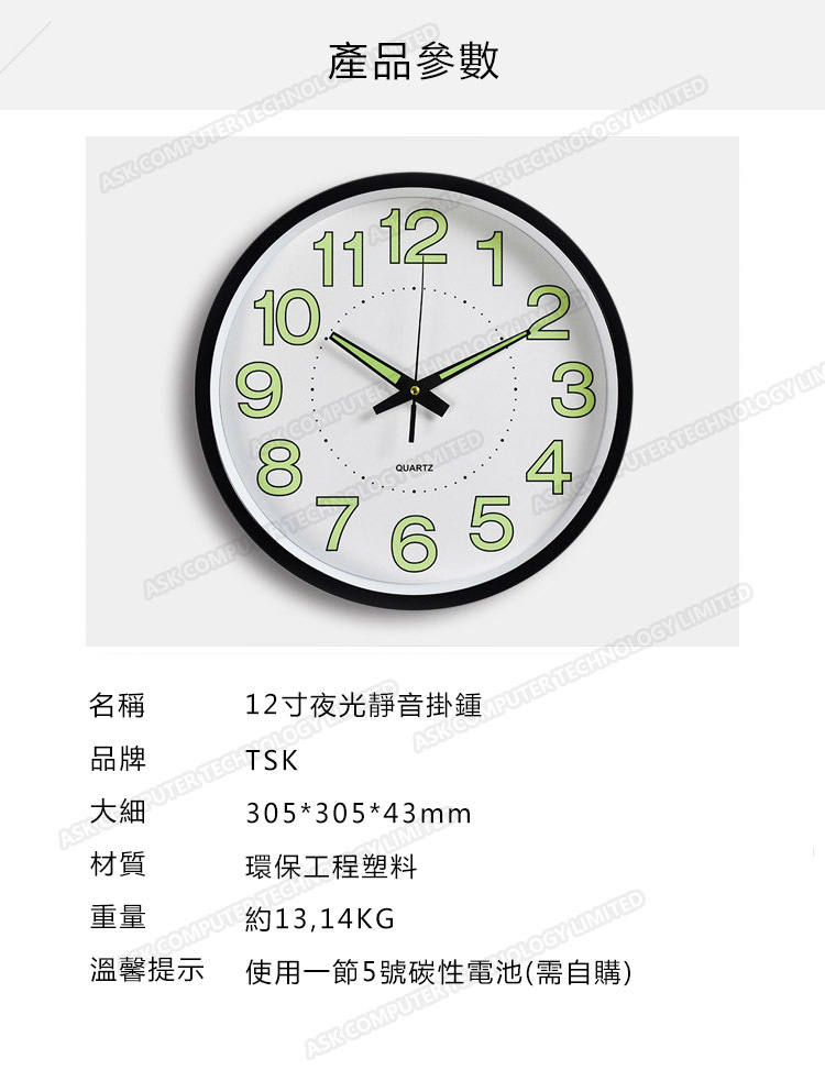 韓國JK 12英寸夜光靜音掛鐘 (P2270)