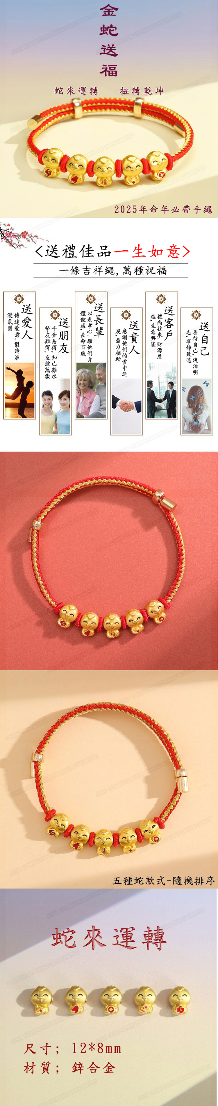 福蛇【金絲紅繩】手鏈手工編織兒童情侶五福蛇生肖蛇