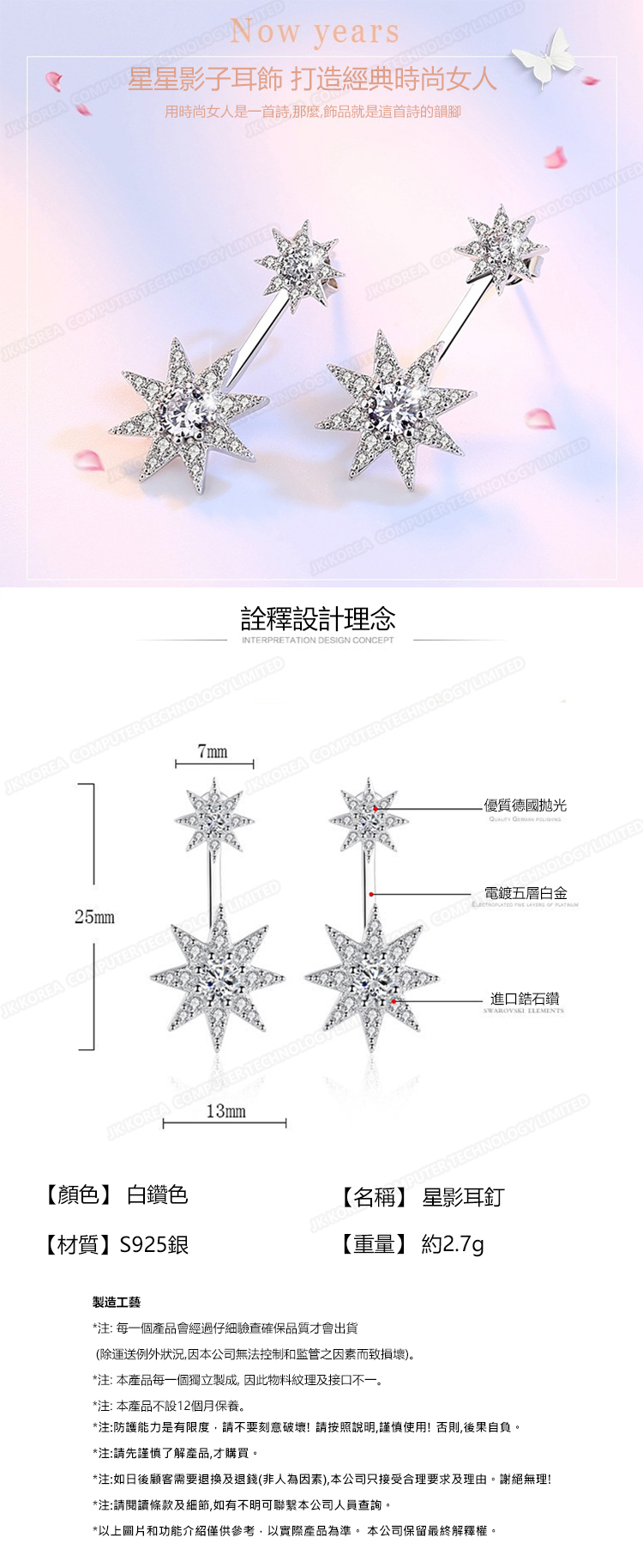 韓國JK 新款時尚大氣八角芒星微鑲銀耳釘後掛式一款兩戴鍍銀耳釘 J0854