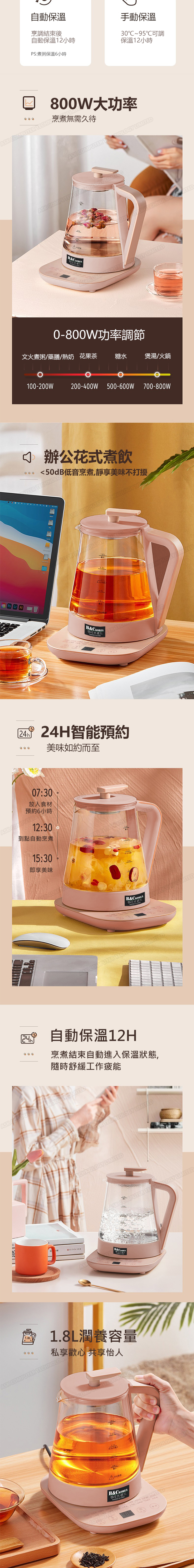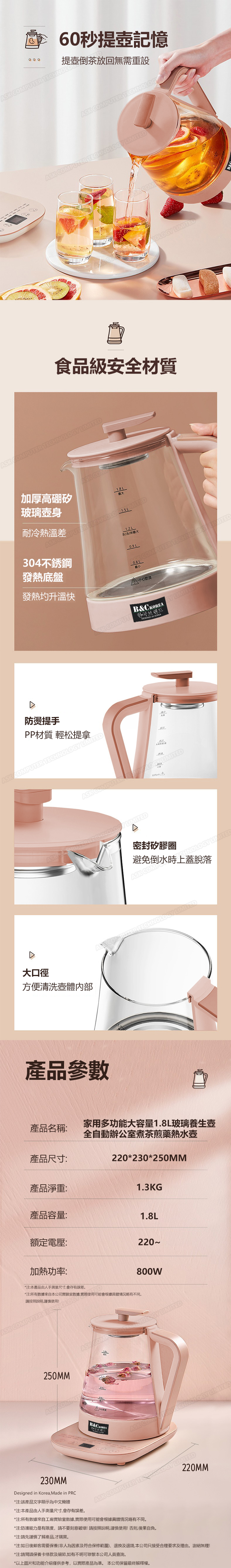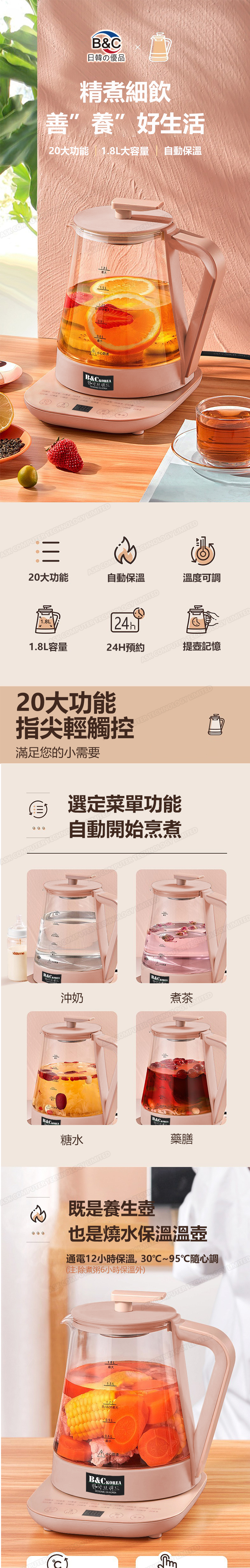 韓國B&C 家用多功能大容量1.8L玻璃養生壺 全自動辦公室煮茶煎藥熱水壺