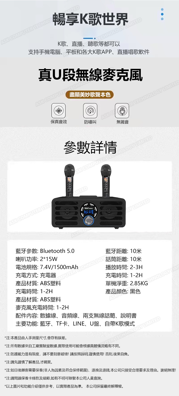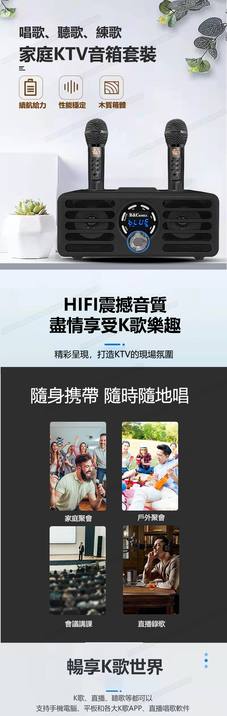 韓國B&C 專業級家用K歌低音炮藍牙音響 支持雙無線話筒合唱雙喇叭音箱