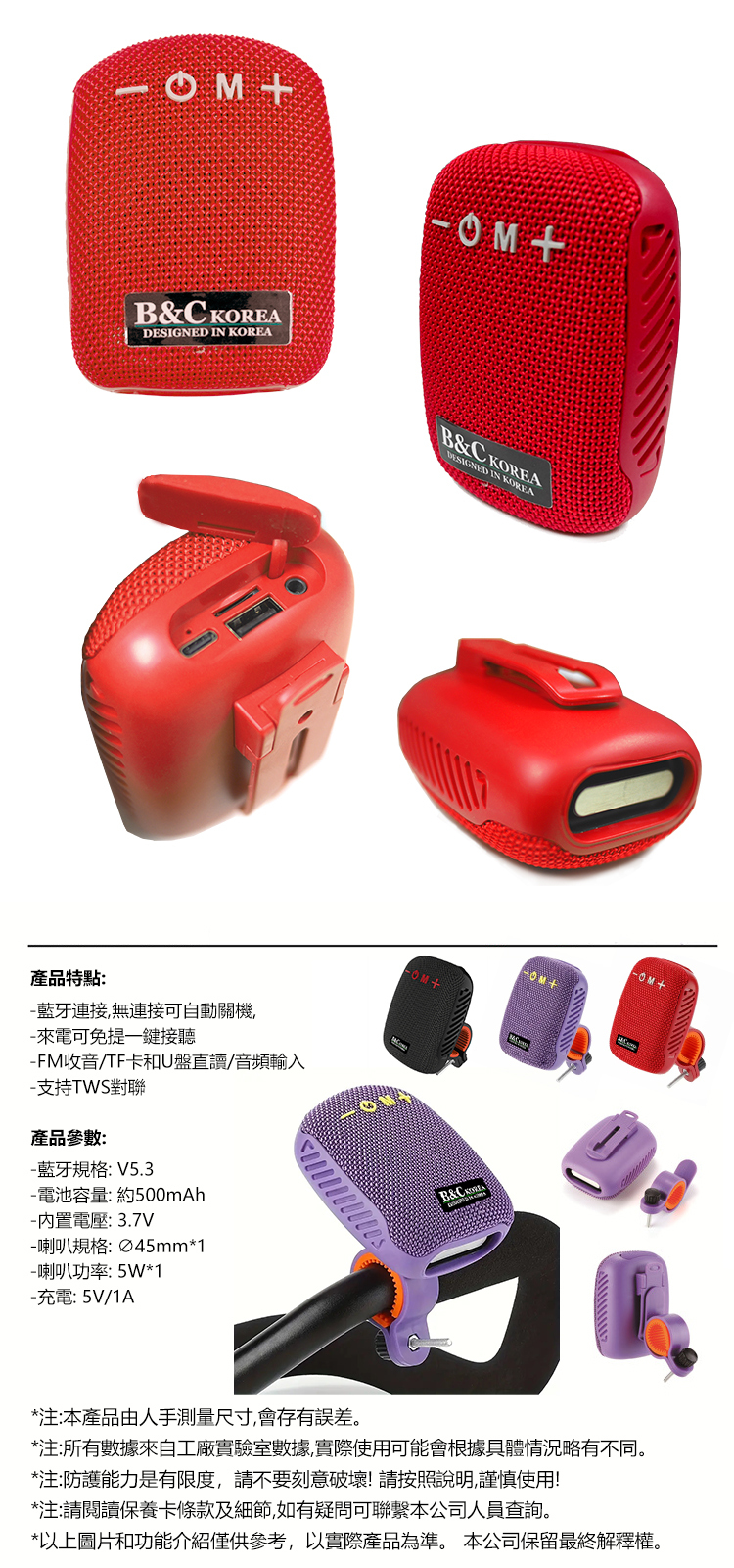 韓國B&C 騎乘藍牙音箱tws對聯布藝插卡收音音箱便攜式防水藍牙音響 (B0270)