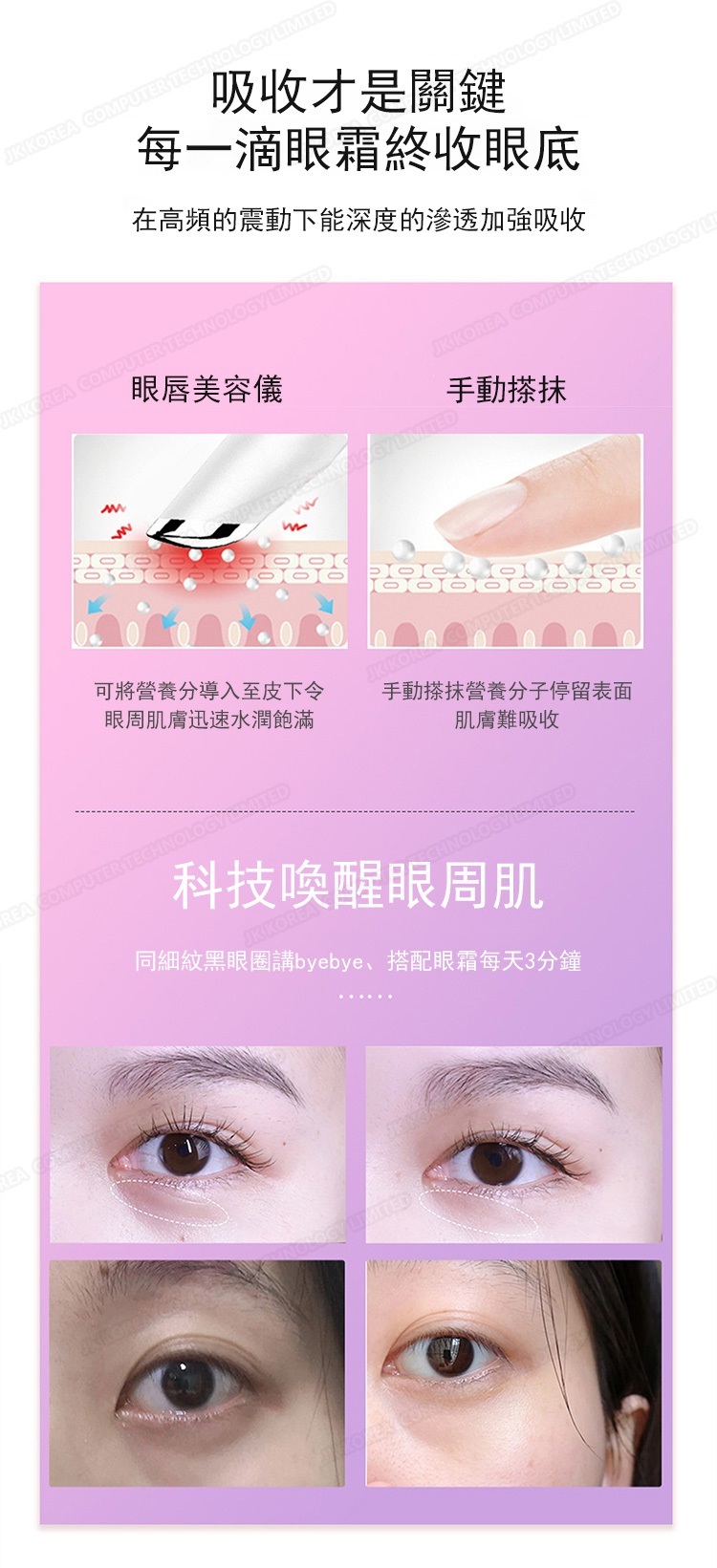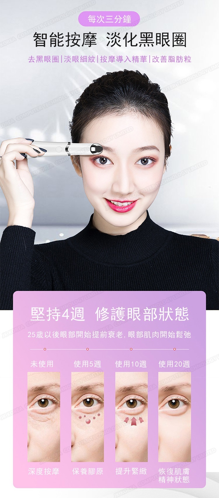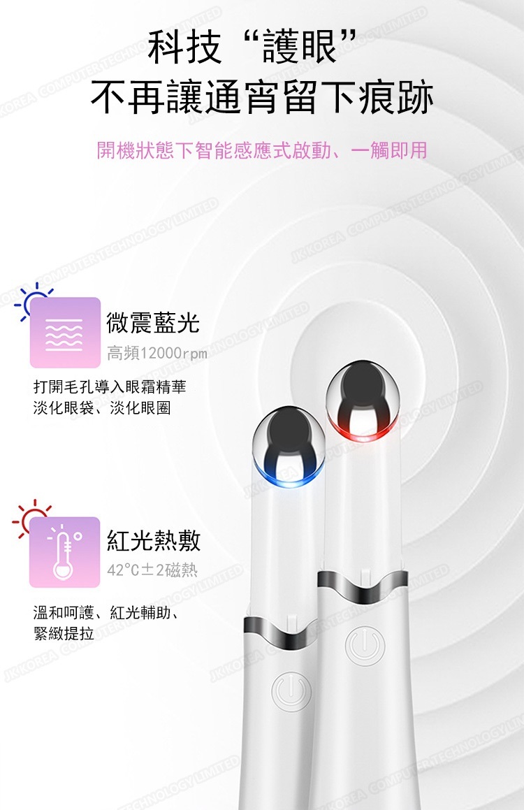 總的來說,韓國JK新款美眼儀是一款集多功能於一體的眼部護理神器,適合所有希望改善眼部肌膚狀況的人士使用。無論是日常保養還是針對特定問題的護理,這款美眼儀都能提供卓越的效果。