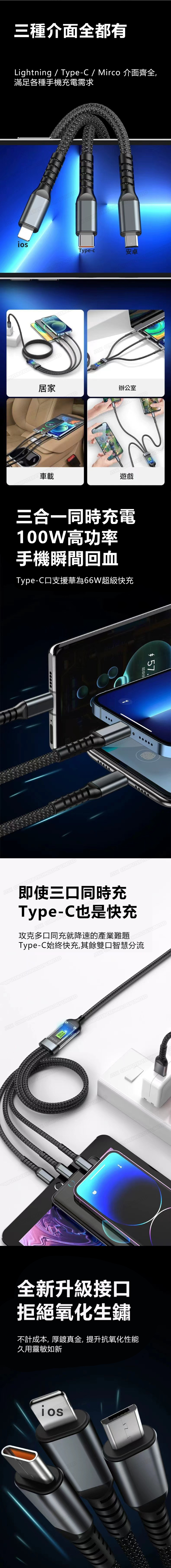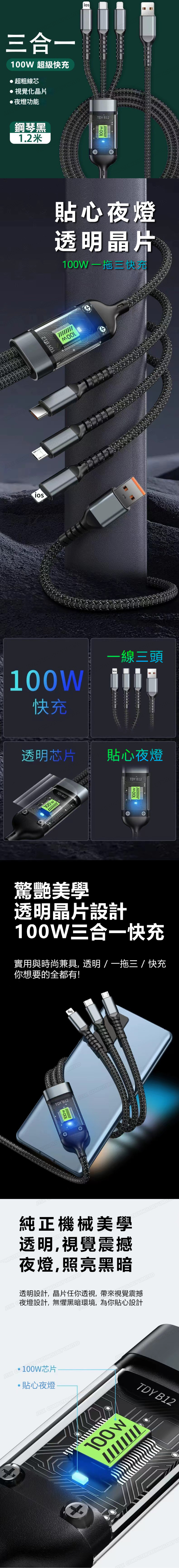 日本TSK 100w 超級快充數據線三合一手機快充車載帶燈一拖三1.2M 充電線 P3967