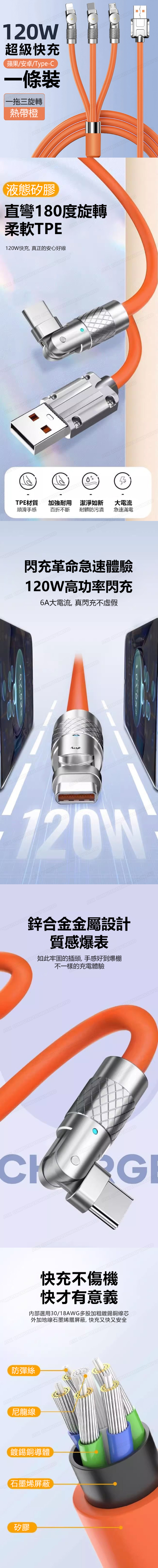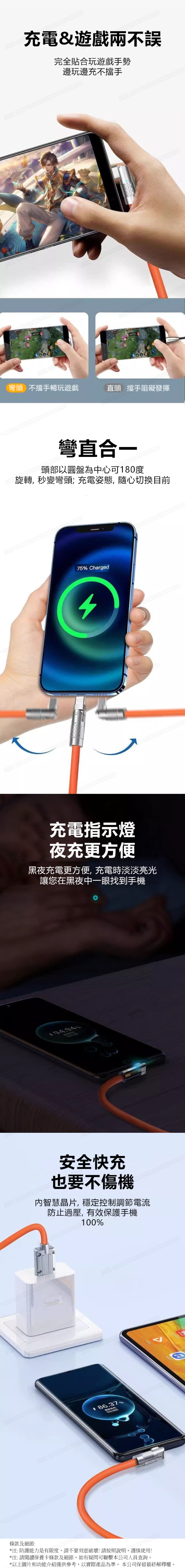 日本TSK 180度旋轉120W 手機數據線彎頭適用蘋果華為安卓 Type-c 快充充電線 (2米) P3969