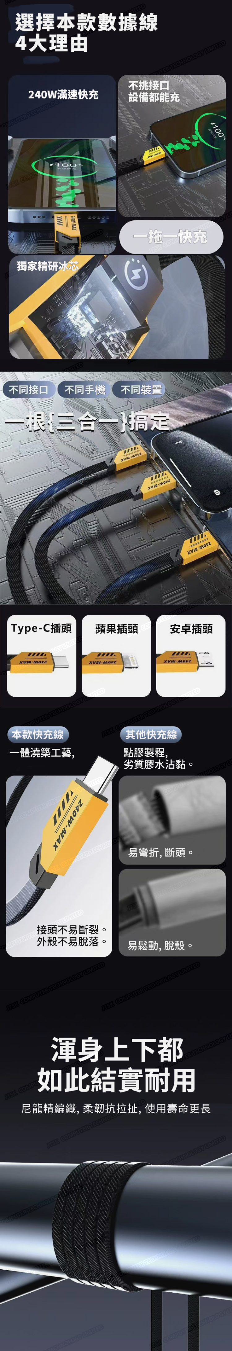 日本TSK 240W 二拖三充電線適用蘋果華為機甲一拖三快充線 Type-c 數據線 P3966