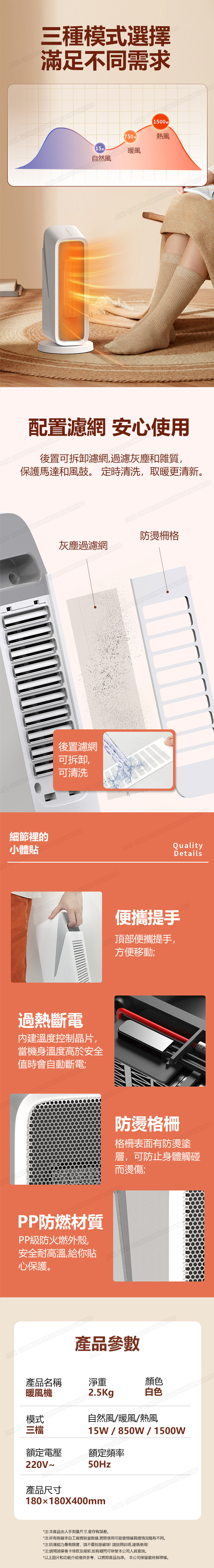 模式:3檔,自然風15W,暖風850W,熱風1500W