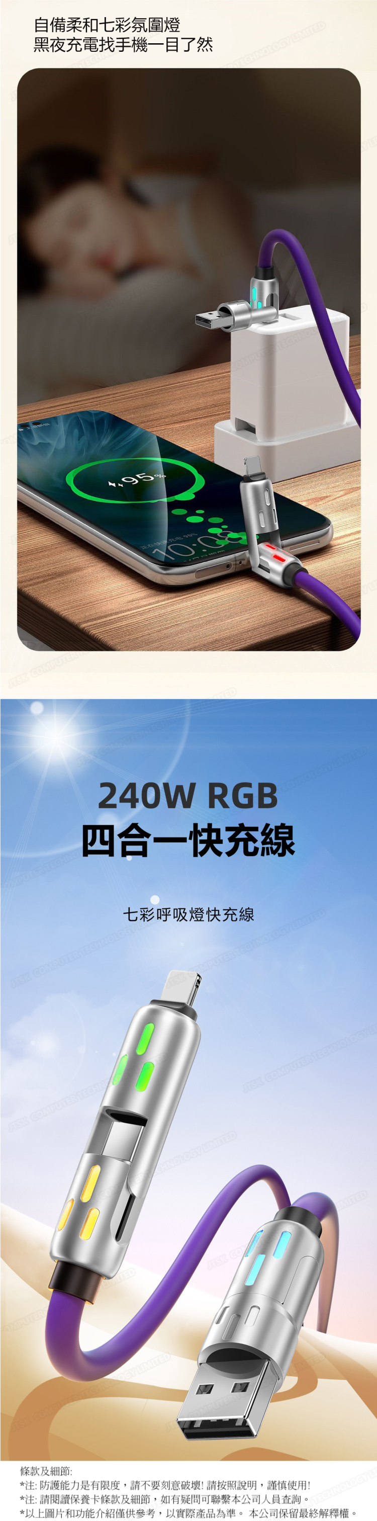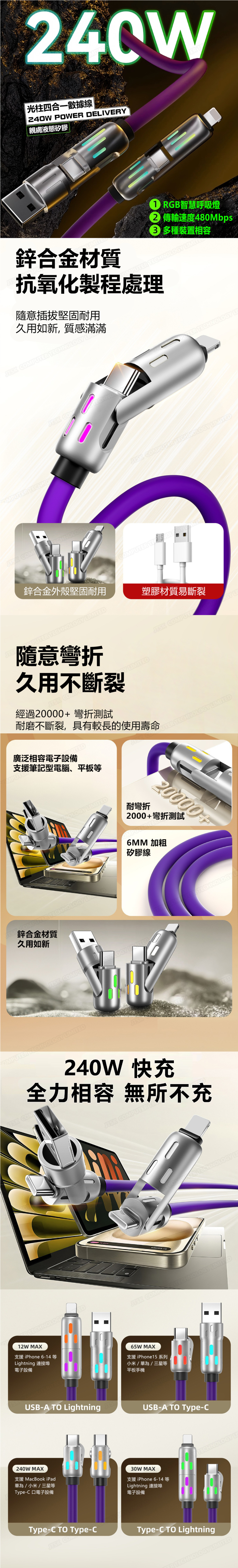 TSK Japan Super soft silicone 240W light column 4 in 1 Typec data cable PD flash charging aluminum alloy colorful light (2 meters) fast charging cable P3968